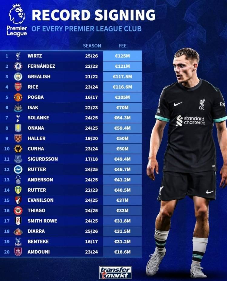 英超杀疯了!25年夏窗至今引援前十:1.25亿维尔茨断层&英超占8席